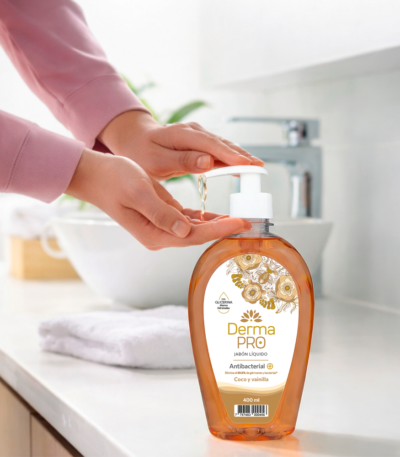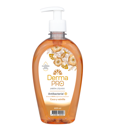* Diseño de botella exclusivo * Acción antibacterial efectiva * Espuma cremosa y abundante * Con agentes humectantes * Fragancias de alta calidad Fragancias disponibles: * Lavanda — notas elegantes de lavanda francesa * Coco y Vainilla — notas dulces y cremosas * Avena y Miel — notas suaves y reconfortantes * Frutos del Campo — notas frutales frescas * Flor de Cerezo — notas florales dulces * Eucalipto — notas herbales frescas Sin fragancia — natural, sin perfume.JABÓN ANTIBACTERIAL DERMAPRO – COCO Y VAINILLA – 400ML
