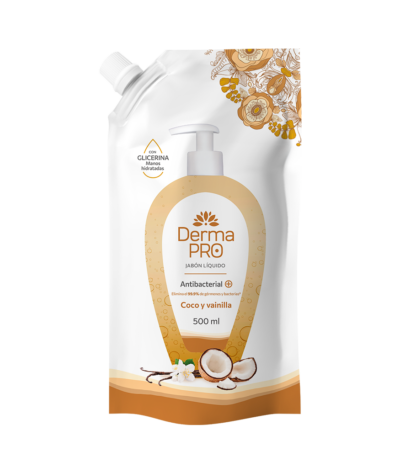 * Diseño de botella exclusivo * Acción antibacterial efectiva * Espuma cremosa y abundante * Con agentes humectantes * Fragancias de alta calidad Fragancias disponibles: * Lavanda — notas elegantes de lavanda francesa * Coco y Vainilla — notas dulces y cremosas * Avena y Miel — notas suaves y reconfortantes * Frutos del Campo — notas frutales frescas * Flor de Cerezo — notas florales dulces * Eucalipto — notas herbales frescas Sin fragancia — natural, sin perfume.JABÓN ANTIBACTERIAL DERMAPRO – COCO Y VAINILLA – 500ML