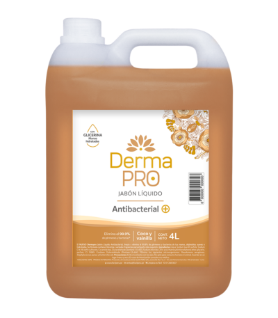 * Diseño de botella exclusivo * Acción antibacterial efectiva * Espuma cremosa y abundante * Con agentes humectantes * Fragancias de alta calidad Fragancias disponibles: * Lavanda — notas elegantes de lavanda francesa * Coco y Vainilla — notas dulces y cremosas * Avena y Miel — notas suaves y reconfortantes * Frutos del Campo — notas frutales frescas * Flor de Cerezo — notas florales dulces * Eucalipto — notas herbales frescas Sin fragancia — natural, sin perfume.JABÓN ANTIBACTERIAL DERMAPRO – COCO Y VAINILLA – 4L