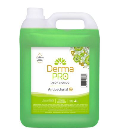* Diseño de botella exclusivo * Acción antibacterial efectiva * Espuma cremosa y abundante * Con agentes humectantes * Fragancias de alta calidad Fragancias disponibles: * Lavanda — notas elegantes de lavanda francesa * Coco y Vainilla — notas dulces y cremosas * Avena y Miel — notas suaves y reconfortantes * Frutos del Campo — notas frutales frescas * Flor de Cerezo — notas florales dulces * Eucalipto — notas herbales frescas Sin fragancia — natural, sin perfume.JABÓN ANTIBACTERIAL DERMAPRO – EUCALIPTO – 4L