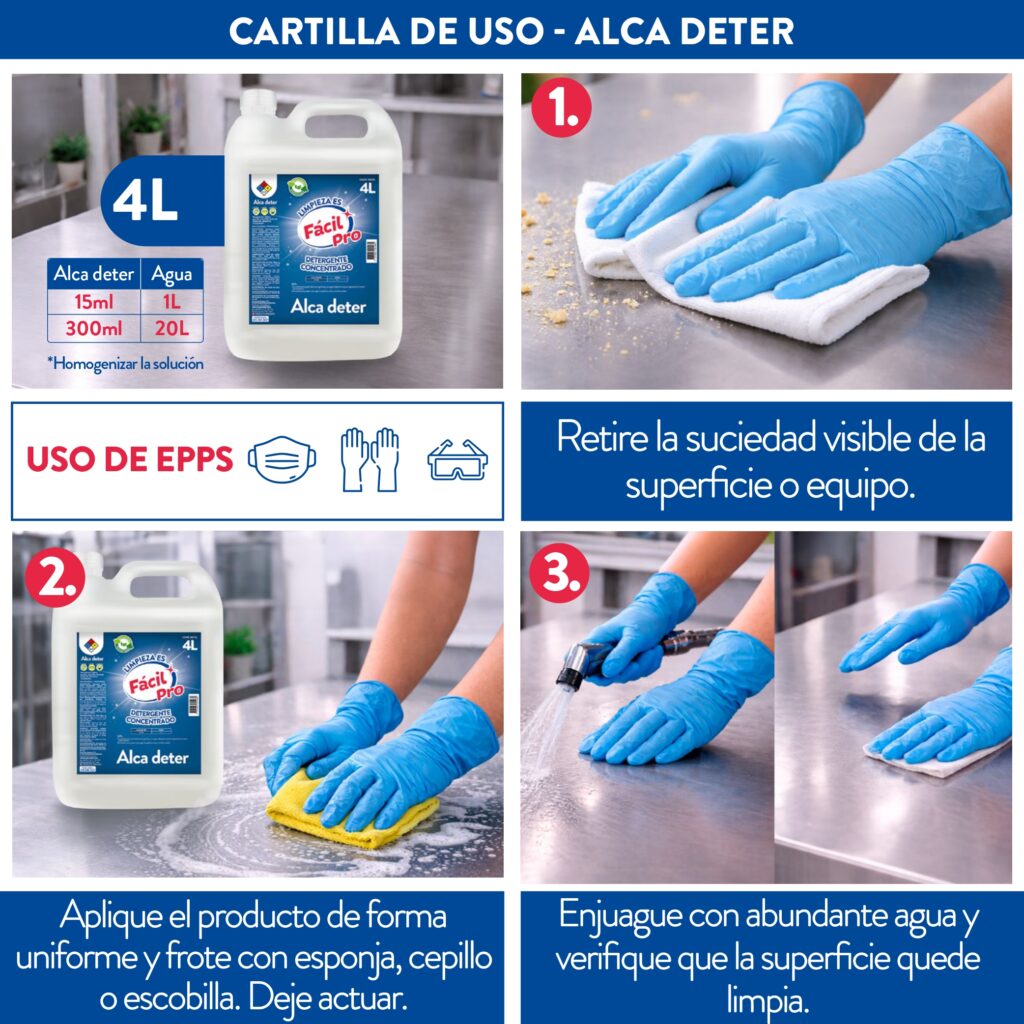 Alca Deter es un detergente alcalino concentrado para limpieza profunda de superficies con alta carga de grasa. Desarrollado para uso HORECA, institucional e industrial, actúa eficazmente sobre grasa adherida y suciedad orgánica, facilitando una limpieza rápida y eficiente.