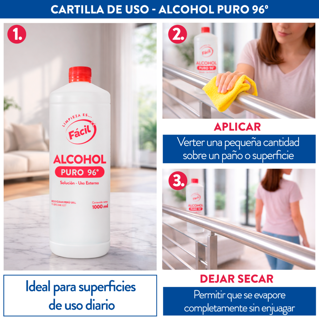 Alcohol de alta pureza diseñado para limpieza y desinfección de superficies. Su rápida evaporación facilita una higiene eficaz sin dejar residuos, ayudando a mantener los espacios limpios y desinfectados en el hogar o en el trabajo.
