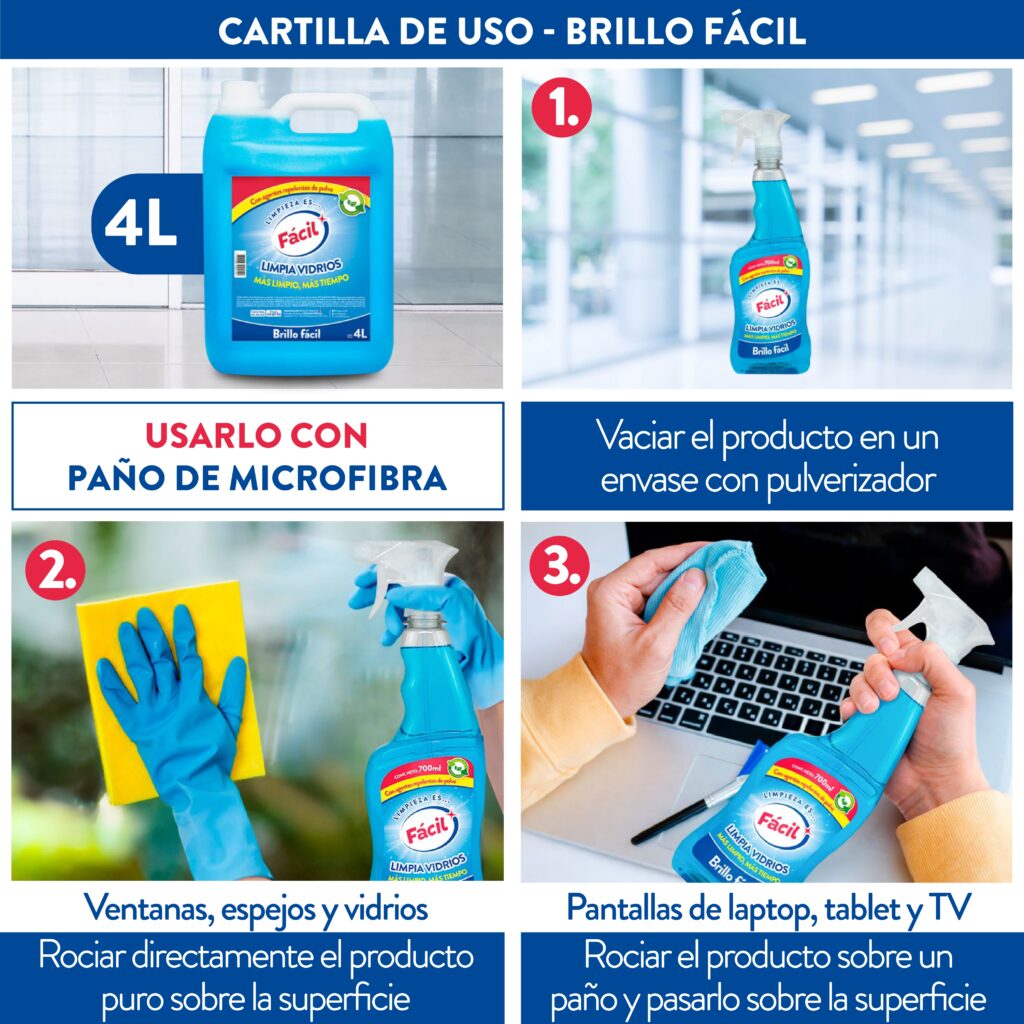 Brillo Fácil es el único limpia vidrios del mercado con agentes repelentes de polvo. Su fórmula crea una película antiestática que ayuda a repeler el polvo y mantener las superficies limpias por más tiempo. Limpia profundamente y se evapora rápido, dejando vidrios, espejos y mamparas con transparencia perfecta, sin marcas ni manchas.