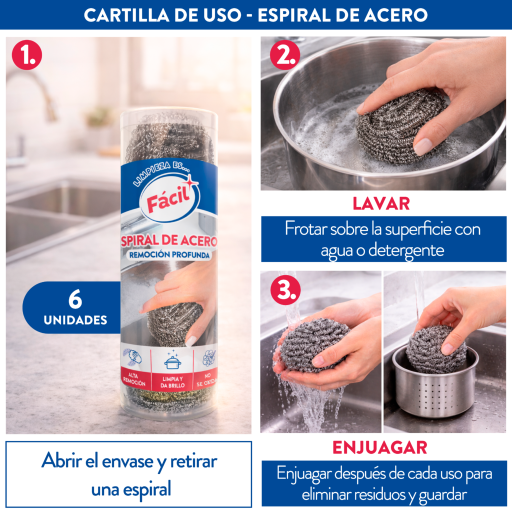 Recomendada para limpieza profunda en cocinas domésticas o comerciales. Presentación paquete de 6 unidades, colores plateado y dorado. Peso por espiral 14.7 g.