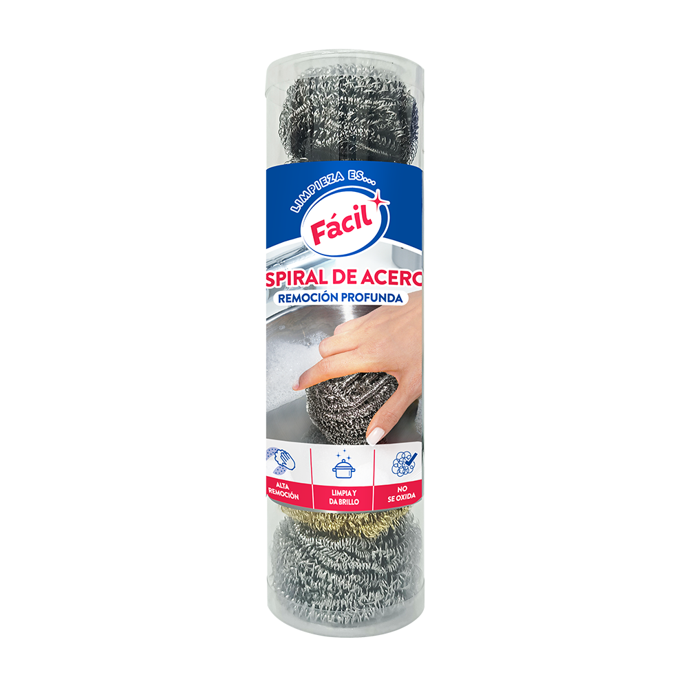 Espiral de acero resistente diseñada para remover grasa y suciedad incrustada en utensilios de cocina. Su estructura metálica limpia eficazmente ollas, sartenes y parrillas, ayudando a eliminar residuos difíciles en tareas de limpieza pesada.