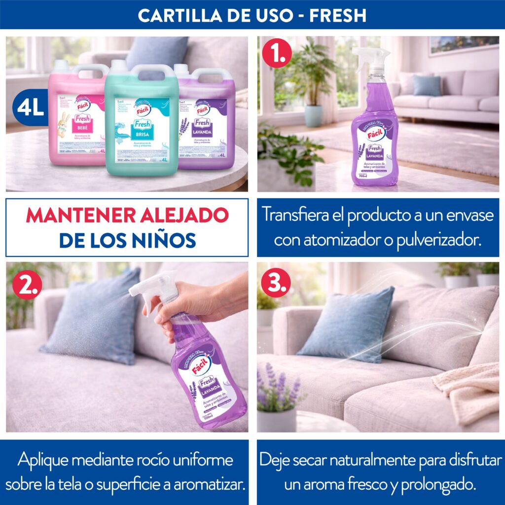 Fresh es un perfumador concentrado con fragancias elegantes para telas y ambientes. Deja un aroma limpio y duradero sobre ropa, cortinas, sofás y todo tipo de tejidos.