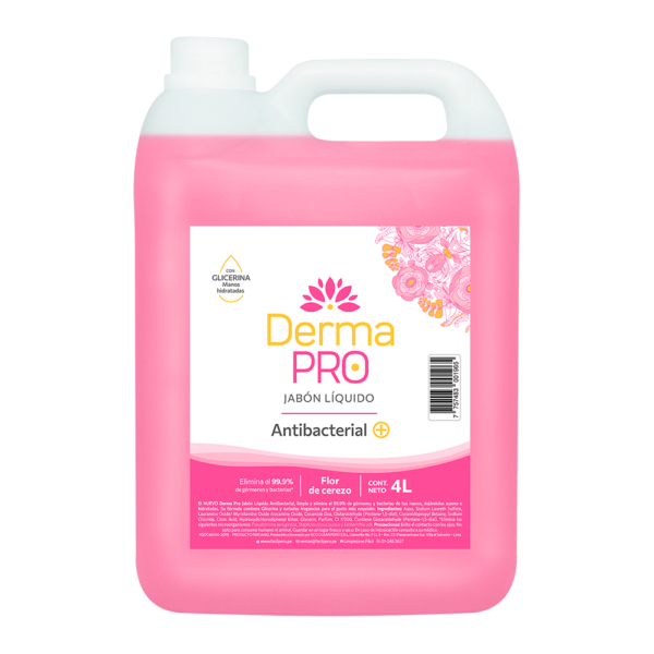 * Diseño de botella exclusivo * Acción antibacterial efectiva * Espuma cremosa y abundante * Con agentes humectantes * Fragancias de alta calidad Fragancias disponibles: * Lavanda — notas elegantes de lavanda francesa * Coco y Vainilla — notas dulces y cremosas * Avena y Miel — notas suaves y reconfortantes * Frutos del Campo — notas frutales frescas * Flor de Cerezo — notas florales dulces * Eucalipto — notas herbales frescas Sin fragancia — natural, sin perfume.JABÓN ANTIBACTERIAL DERMAPRO – FLOR DE CEREZO – 4L