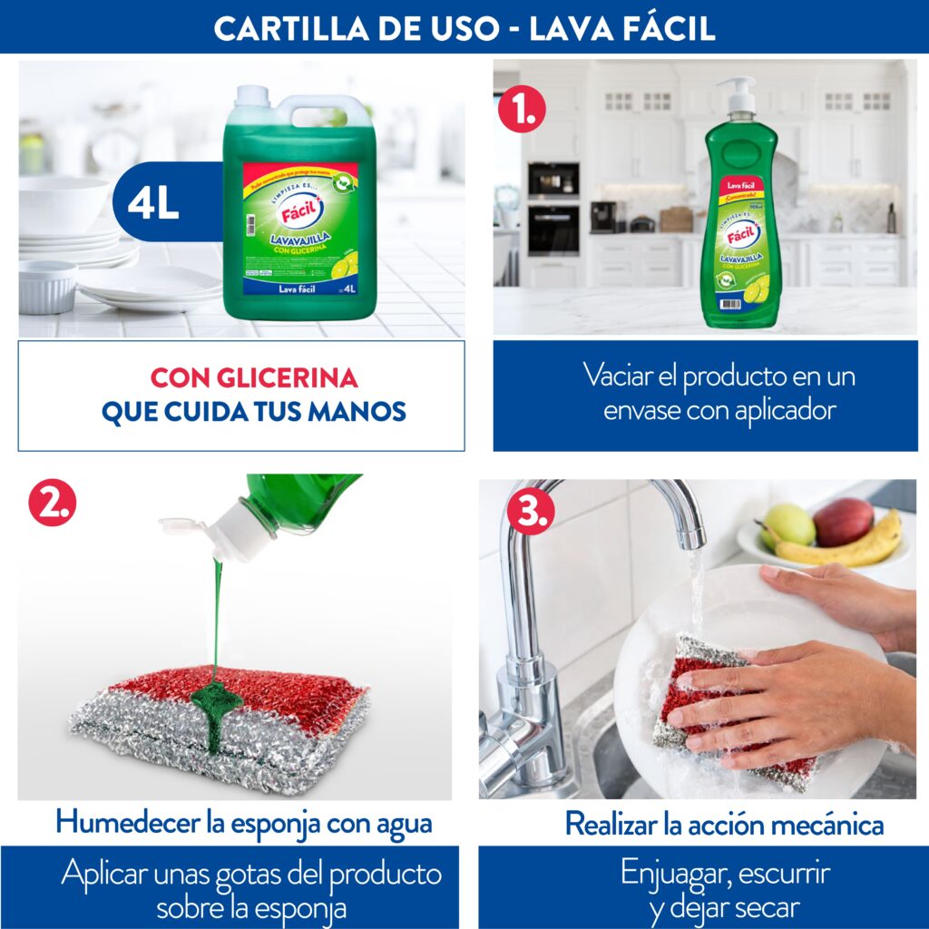 Lava Fácil es la única lava vajilla del mercado que cuida tus manos mientras limpia profundamente. Su fórmula elimina grasa y residuos de comida con espuma abundante que mejora el rendimiento del lavado, dejando platos, vasos y ollas realmente limpios.