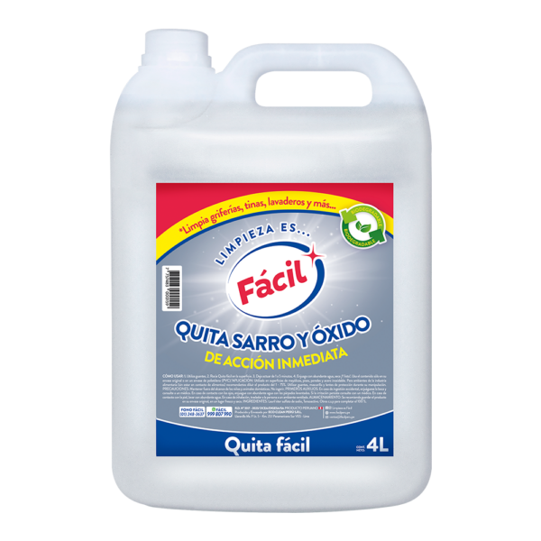 Quita Fácil es el ácido más seguro del mercado. Actúa como ácido muriático sobre el sarro y el óxido, pero al contacto con la piel se comporta como un jabón, ofreciendo una experiencia de uso más segura. Su fórmula actúa directamente sobre las incrustaciones y facilita la limpieza.