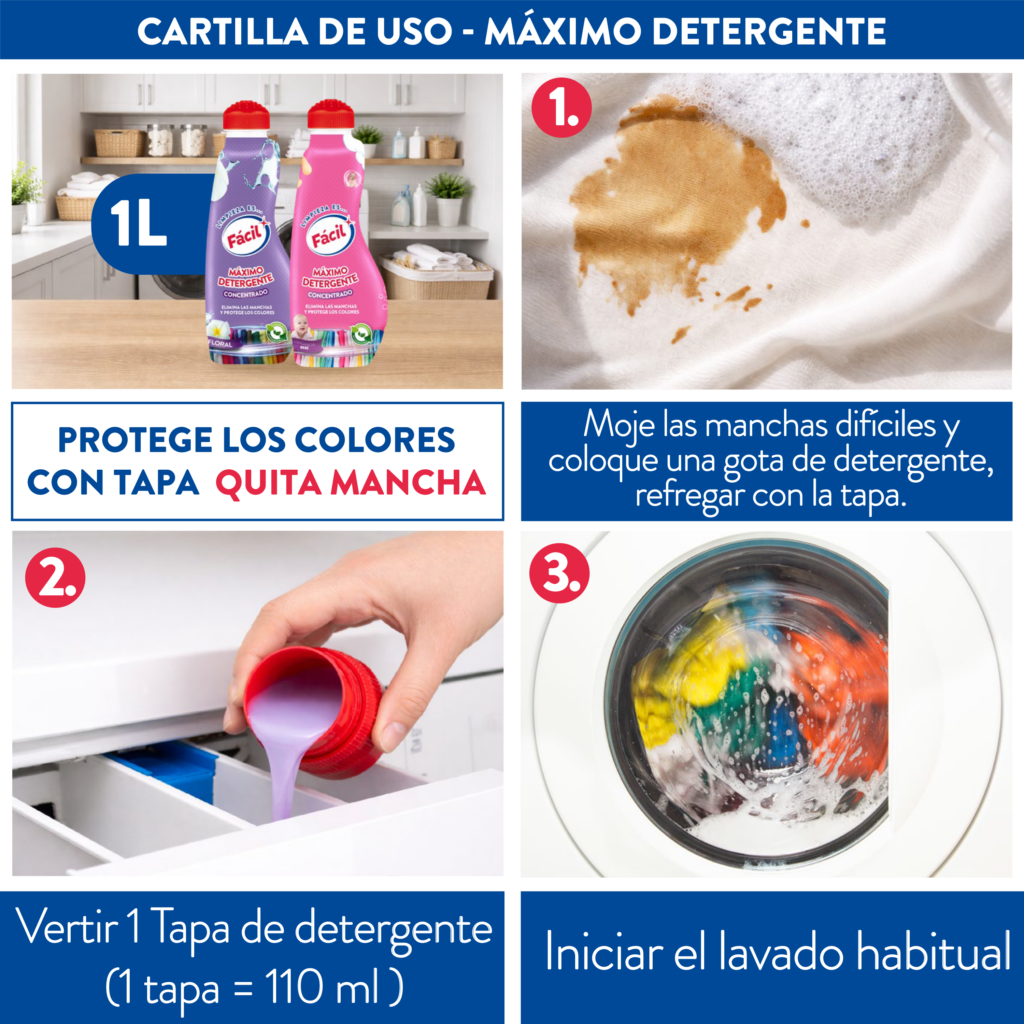 Máximo ofrece poder de limpieza que se nota desde el primer lavado. Su fórmula actúa sobre las fibras para remover grasa, suciedad y manchas difíciles, mientras ayuda a preservar los colores y la textura de las prendas. La formulación concentrada mejora el rendimiento por carga y facilita un enjuague rápido.