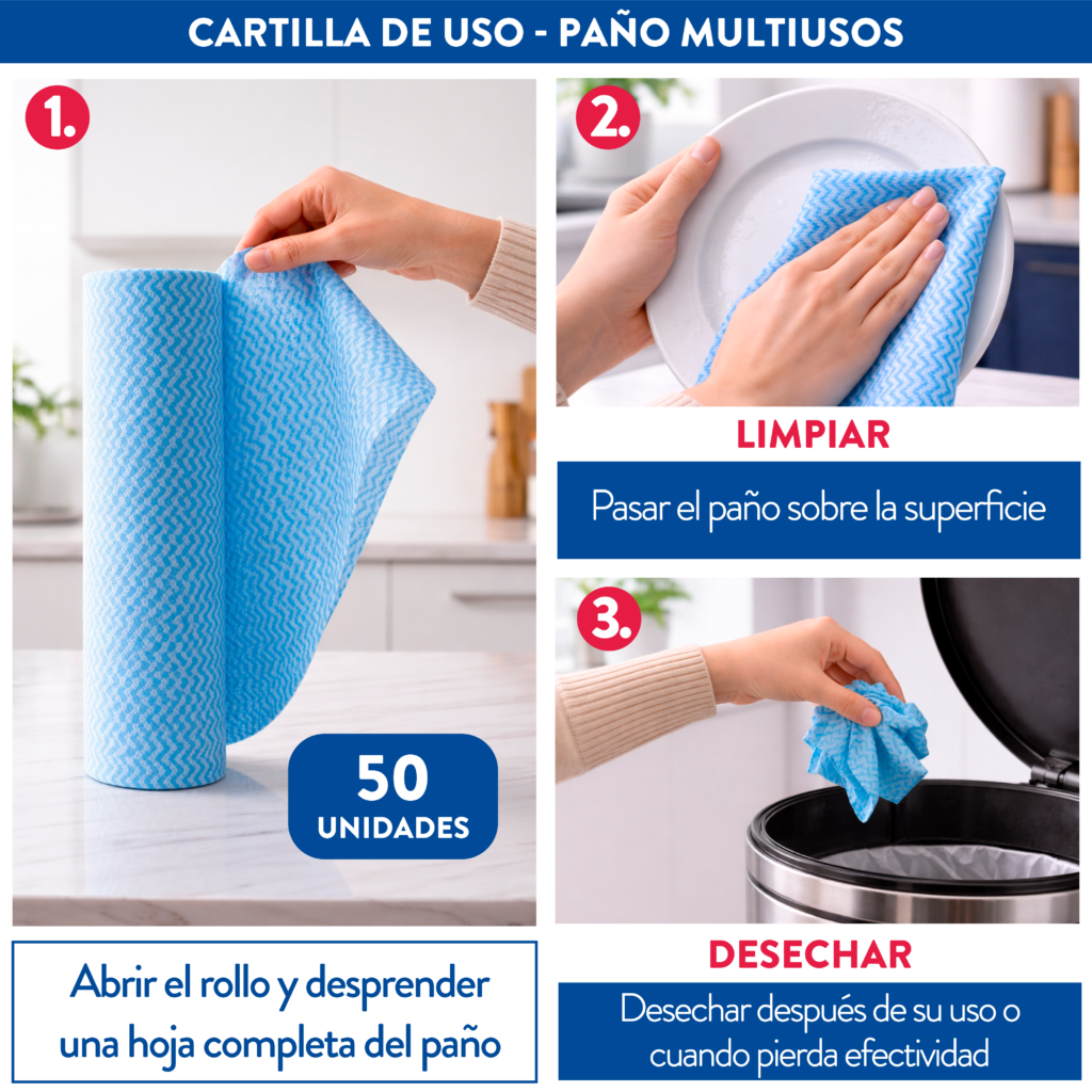 Paño multiusos resistente de un solo uso que brinda mayor higiene en cada limpieza. Su material absorbente retiene líquidos y suciedad sin dejar residuos, facilitando una limpieza rápida y práctica en diferentes superficies.