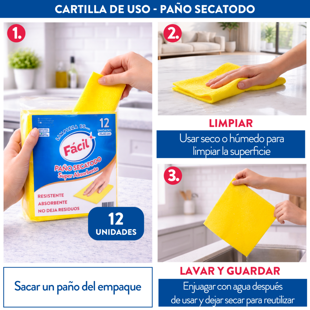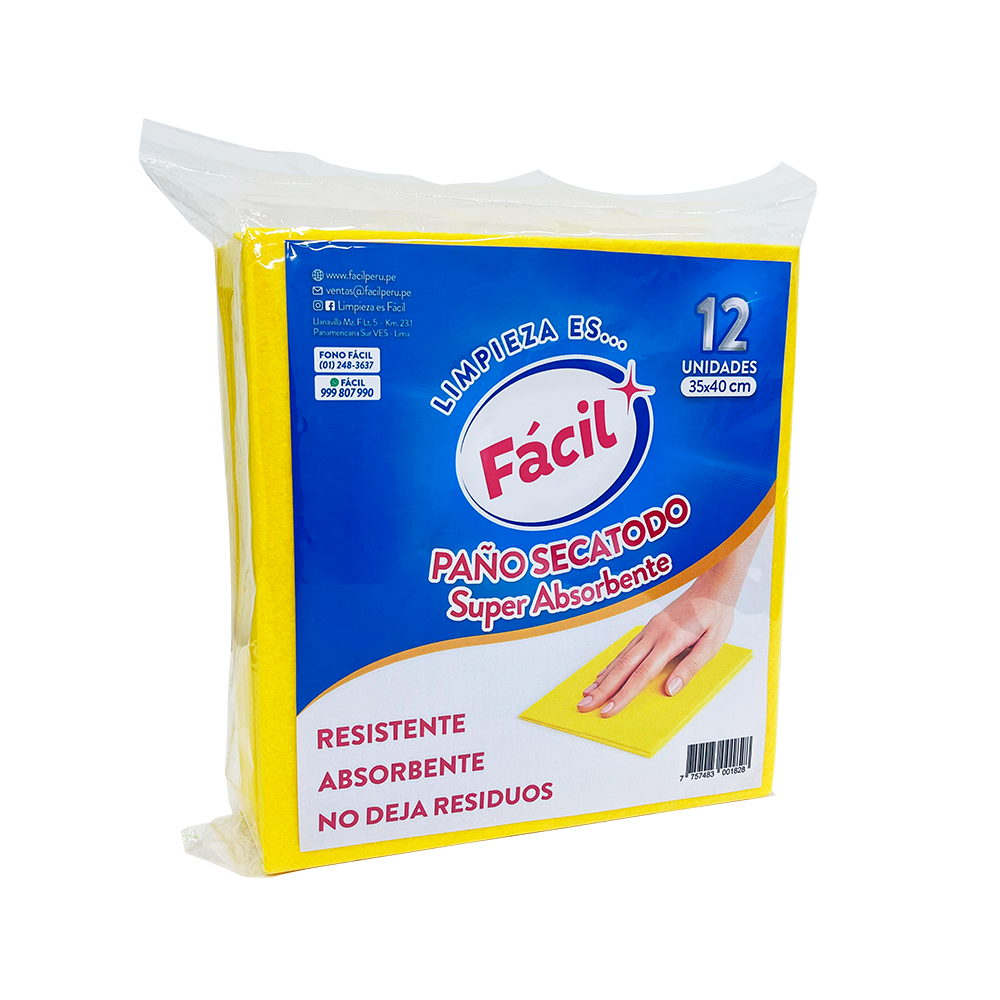 Paño Secatodo de alta absorción diseñado para secar superficies de forma rápida y eficiente. Su material resistente absorbe líquidos con facilidad y permite un uso continuo sin romperse ni deformarse. El acabado especial evita dejar residuos, pelusas o marcas.