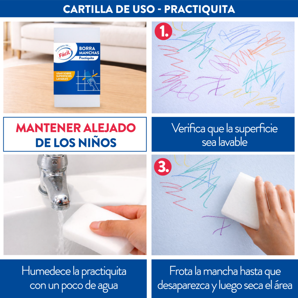 Practiquita es una esponja de polímero de melamina diseñada para eliminar manchas en superficies lavables usando solo agua, sin detergente. Su microestructura actúa como un borrador que ayuda a remover suciedad difícil de paredes, mesas y muebles.