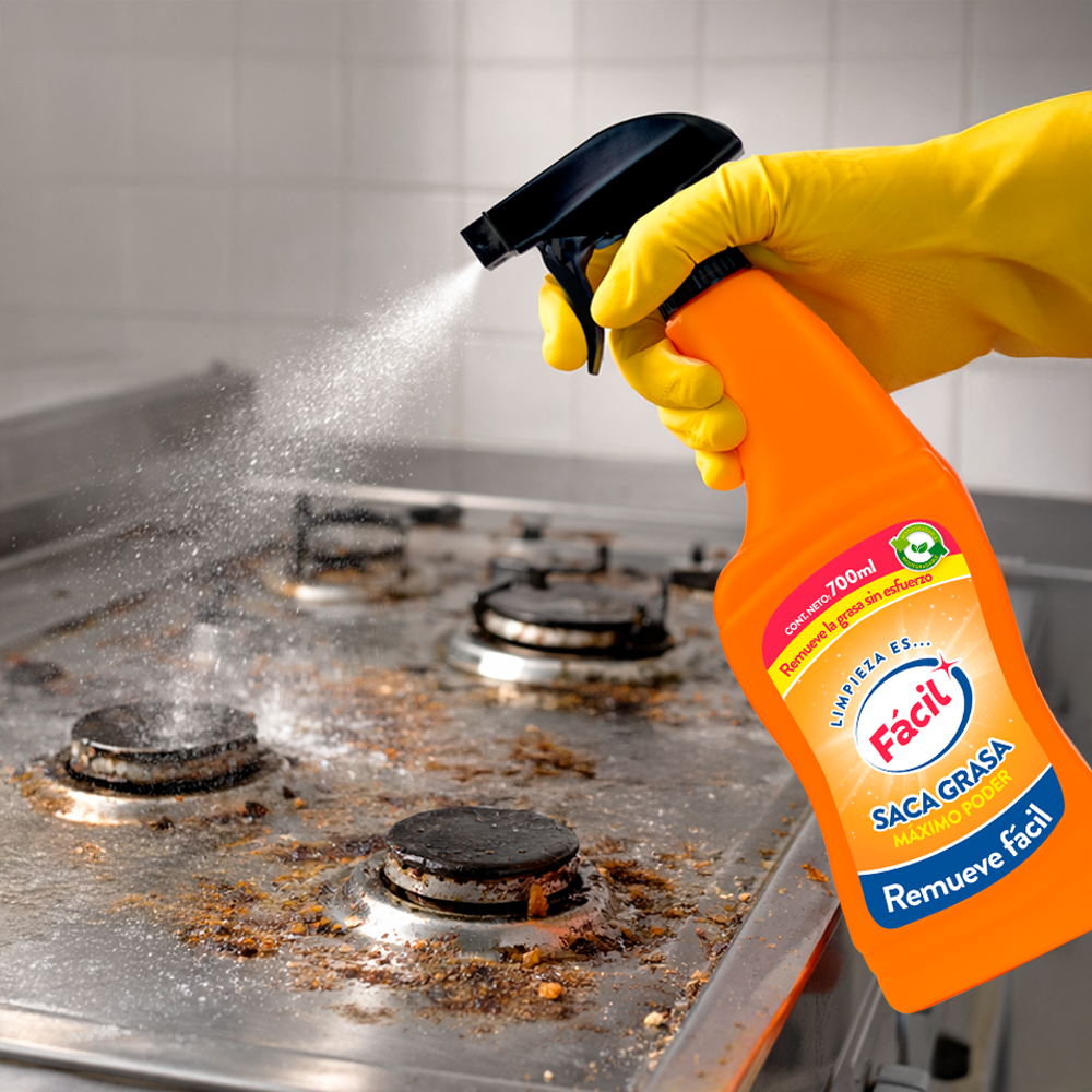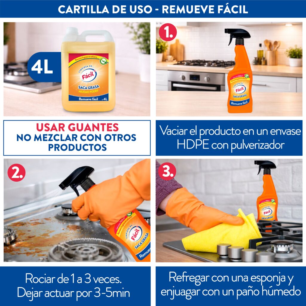 Remueve Fácil es el mejor saca grasa en el mercado, diseñado para disolver incluso la grasa más difícil. Su fórmula potente actúa rápidamente sobre grasa quemada y suciedad incrustada en cocinas, hornos y parrillas, facilitando una limpieza rápida y práctica.